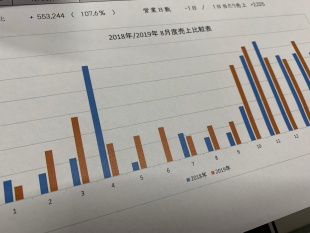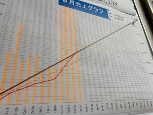 こうして経営者やフロント、経理スタッフだけでなく全スタッフが今の売上状況をグラフで見える化して張出をしております。