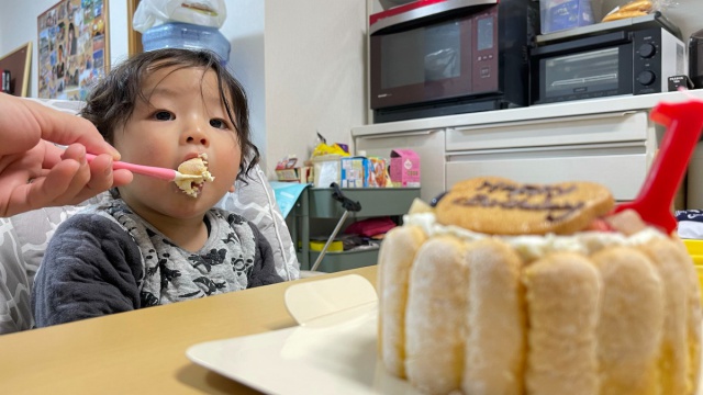 亀山温泉ホテルのファーストバースデーでもご用意しております赤ちゃん用ケーキを嬉しそうに頬張りました。