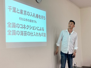 海苔屋さんは海苔をとらない、採るのは海苔漁師さんで、海苔屋さんは海苔漁師さんがとって海苔にしてそれを漁連に卸し(っていう表現が適切かな?)その海苔を落札することで初めて販売する権利を持つそうです。
