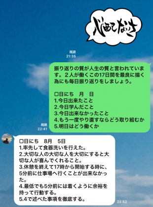 1.今日出来たことは何か?→これは毎日ひとつひとつでも仕事を覚えていることを実感してもらうため、そしてそれを自身で確認してもらうために質問しています。