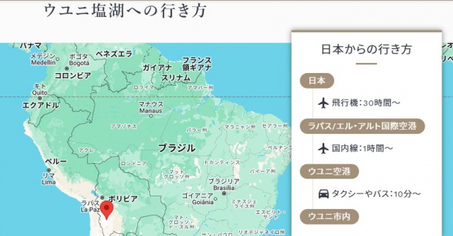By the way, this Yuuni Salt Lake is very, very far away. It's in South America, so it's on the other side of the world. According to the JTB website, it takes 30 hours by plane (international flight)! Then, you have to take a domestic flight for 1 hour, and then you have to transfer by taxi and bus, so the journey is quite tough!