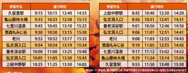【紅葉情報】期間限定で亀山湖と養老渓谷を繋ぐ観光バスが運行します。