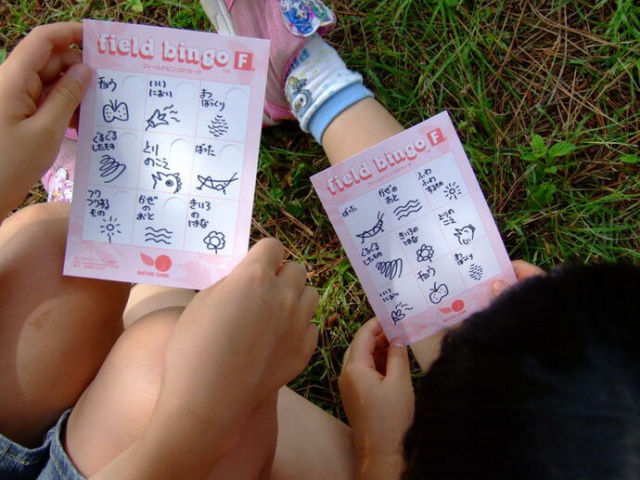 亀山温泉ホテルでトイレを済ませたら「フィールドビンゴ」徒歩3分の森に向かい、一番有名なネイチャーゲーム