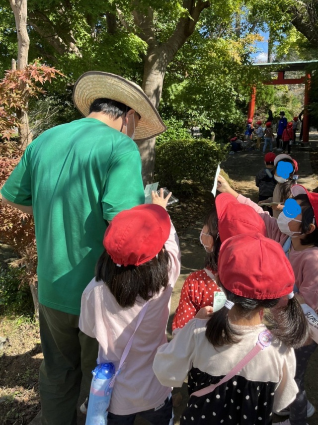 自然の様々な要素があり、先生方の見守りの中、秋の自然素材を探しに行きます。