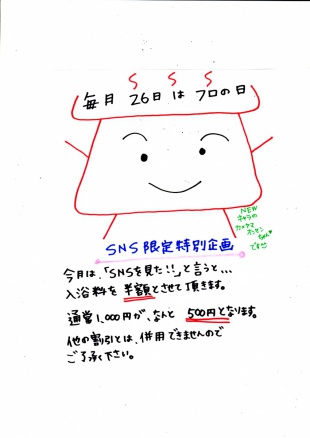 2015年02月21日(土) 亀山温泉だより 2月26日は何の日でしょう?? 2月26日は、恒例のふろの日です(*^。^*) 今回はなんと、入浴料を半額とさせて頂きます!! 通常1,000円のところ、500円でご案内させて頂きます(●^o^●) お昼間はだいぶ暖かくなってきましたが、朝晩はまだまだ冷えますね。。 温泉に入って、体を芯から温めましょう^^ 平日ですので、それほど混雑もせずゆっくり入れると思います★ 皆様のお越しをお待ちしております?(^_^)/~