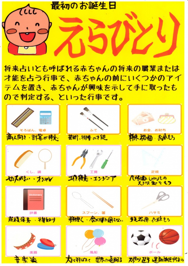 赤ちゃんが1歳になったときに行う「選び取り(将来占い・知恵比べ)」 は、 一升餅祝いとともに行うことが多いようです。 選び取り(将来占い)とは、 並んだ複数の品の中から赤ちゃんが最初に取るもので、 将来の職業や才能を占う記念行事です