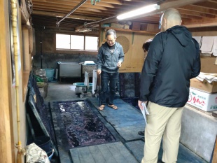 Mr. Nobuo Matsubara, a dyer (indigo dyer), has a workshop about 5 minutes by car from our hotel. Mr. Matsubara maintains the traditional Japanese indigo dyeing and weaving technique, Nagaita Chugata.