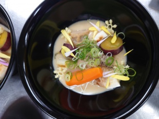 内容は ・ぶり ・出汁のクリーム餡 ・大根 ・人参 ・焼葱 ・揚蓮根 ・九条葱 ・胡椒 ・菊花 ・雪結晶パスタ です。