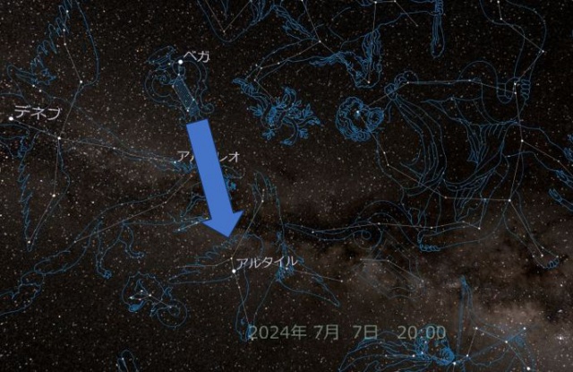 織姫を見つけたら、下に(角度45度ほど)視線を移すと彦星(アルタイル)があります。