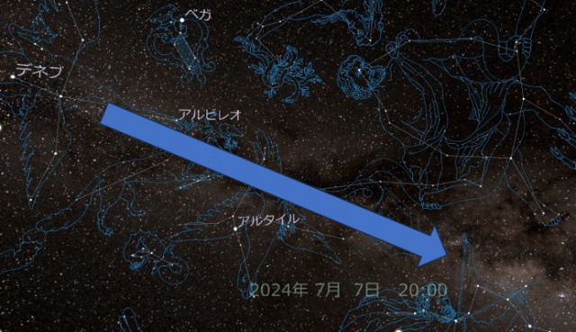 The Milky Way flows between Orihime and Hikoboshi in the direction of the arrow, and the constellation Cygnus (Deneb) appears to be flying in the direction of the arrow (Reference: How to find the Summer Triangle, Gunma Observatory)