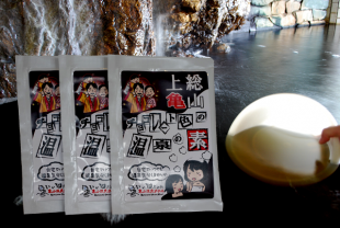約2年半前に制作したこの亀山温泉の素(天然成分ではございません)は、温泉にはいってくださったお客様が御土産に自宅用に最適と、年間800袋ほど売れています。また10回分はいった温泉の素も、お喜びいただき150袋ほど出ています。