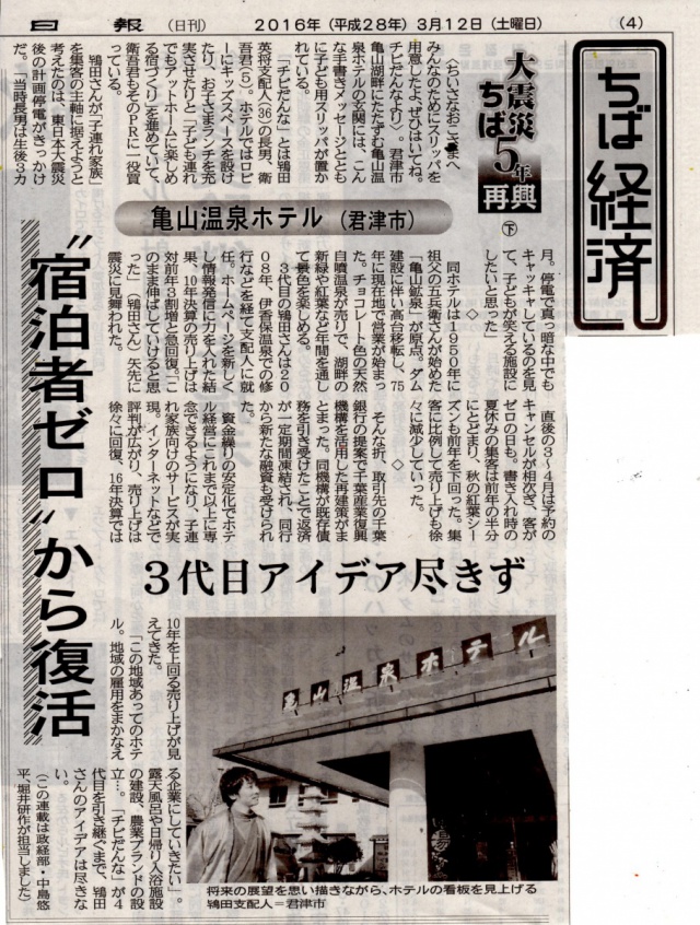 3月12日千葉日報新聞に亀山温泉ホテルが紹介されました