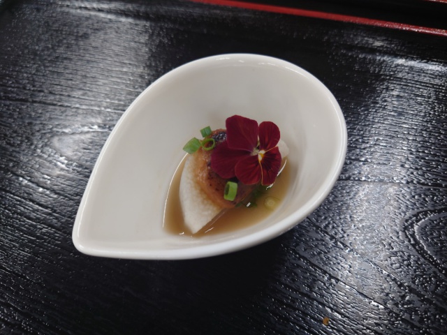 ・焼茄子銀杏海老のいりこ出汁琥珀ゼリー寄せ 小麦 大豆 海老(甲殻類)ゼラチン