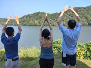 自然の中でのヨガがとても気もち良かった、ヨガの最後にやった腕振りのポーズが、最近、本で調べた太極拳の動きと同じだったのでビックリした(左側:息子さん)