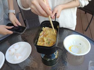 今回は学校の屋上でアウトドア料理の実習です(2年生)